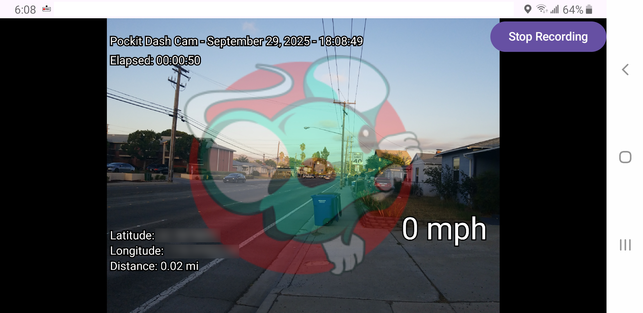 A vehicle dash cam app using your phone as the camera. HUD overlay to display time, speed, and GPS location, which are recorded with the saved video. Dash Cam can record and continue running in the background so it does not interfere with other applications in the foreground, like maps, directions, phone calls, etc.